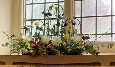 The photos in this column were taken during preparation for Easter. All displays were created entirely by the members of the St. Giles team. At the major festivals of Christmas, Mothering Sunday, Easter and Harvest all the teams work together to fill the church with beautiful colours and aromas. There are no flowers in church during the reflective time of Lent, and only greenery during Advent. <