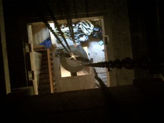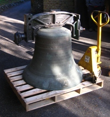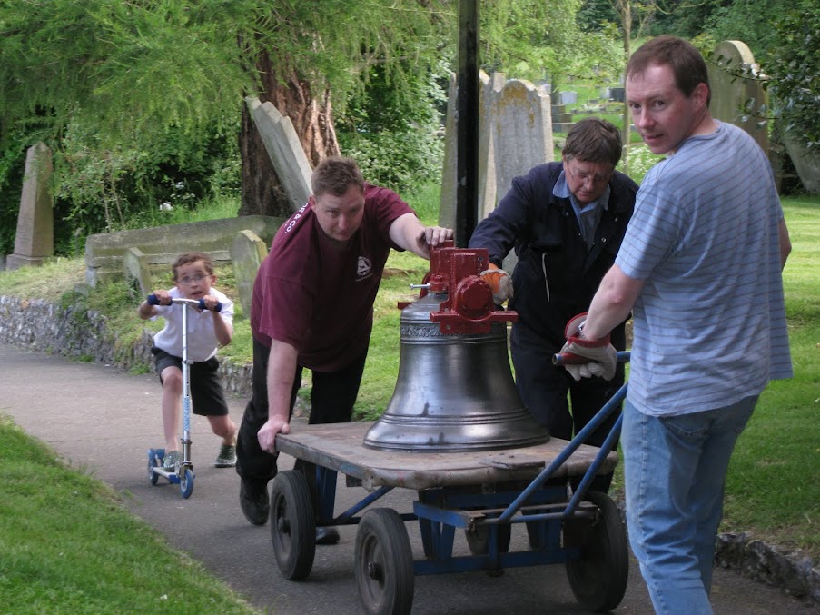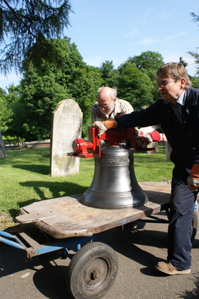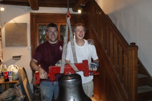 The second phase of the bell installation resumed on Tuesday 26th June 2012, when the G&J bell was delivered to Farnborough to be reinstalled in the tower. It arrived together with its frame sides and fittings, and fortunately there was a goodly gathering of helpers at the right time in the afternoon to unload it from the van and then trolley it to the base of the tower.During Wednesday and Thursday the stays were fitted as were the new pendulum sliders, which were then suitably adjusted. All this work was either done or overseen by the other Paul Mason from Loughborough. A number of helpers were enlisted on a daily basis to help with aspects of the work, and great thanks are due to them. Some helpers were from other towers in the District and indeed from other Districts.