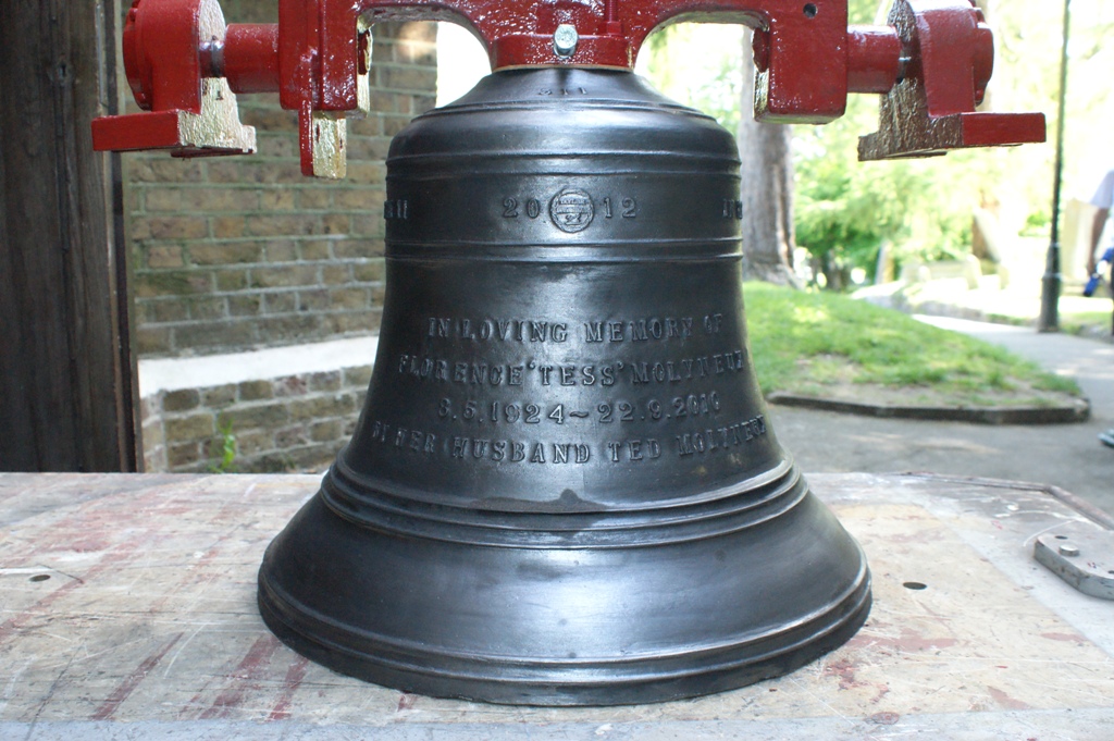 2012 Six bells were acquired from John Taylor Bellfounders (having been earlier cast as the front six of a new ring of ten for Old St. Martin's church in Worcester, but subsequently made available after a different front six was cast). The 2nd was recast (on 16th Feb) and all six were hung in a new grillage frame. The existing bell was refitted and rehung with full circle ringing fittings elsewhere in the tower.