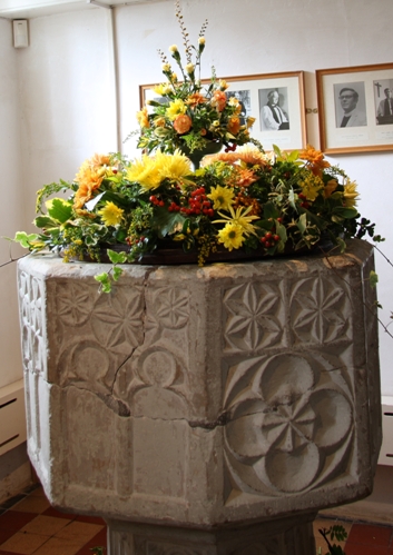 and dates from the latter half of the 14th century. The octagonal bowl, which has been badly cracked in time past, has eight different geometric panels. Five are made up of quatrefoils and abstract flower panels, and three chiefly contain what appear to be stylized human figures. The font was originally lime-washed and coloured, traces of which remain. The stem on which the bowl stands is of the Victorian period. |