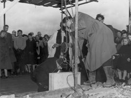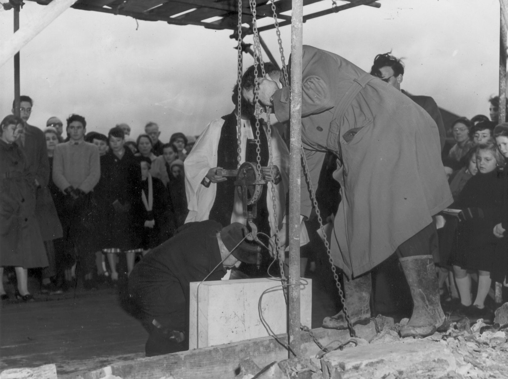 After the extremely slow (and sometimes negative) progress that had been made during the past years, events now moved with almost breath-taking rapidity. The ground was quickly cleared and on Sunday, 8th December 1957, at a simple but inspiring ceremony witnessed by a large assembly, the Foundation Stone was laid by Mrs. Guy Warman. This was a most happy choice as it gave the Rector and Church Council the opportunity of showing their appreciation for the counsel and guidance so freely given by the late Bishop Guy Warman during his residence in the parish.
