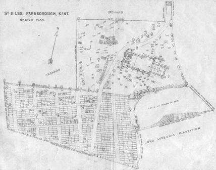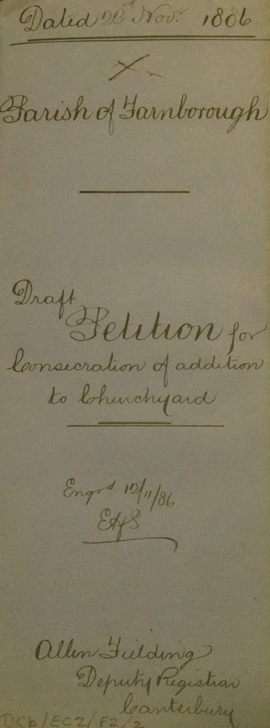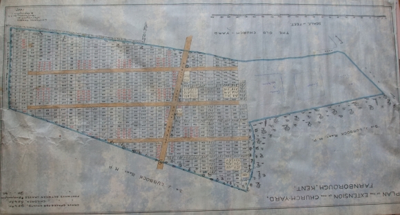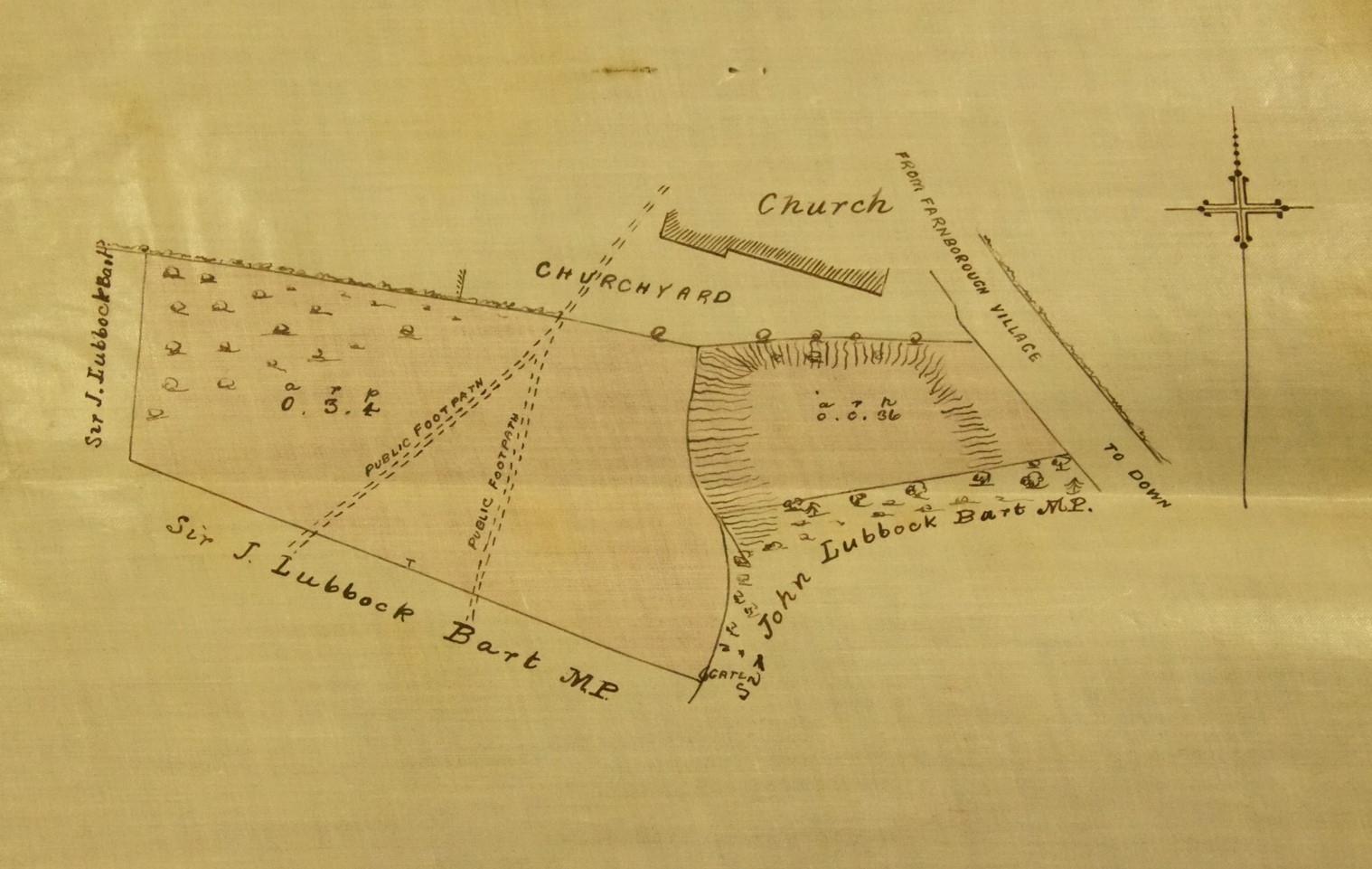 Once Farnborough became a full parish in 1885 an arrangement was made to purchase land from the Lubbock family to extend the graveyard.The plan above shows what is now part of the main graveyard before purchase, and to the right is the cover page from the purchase petition. Both are dated 1885.