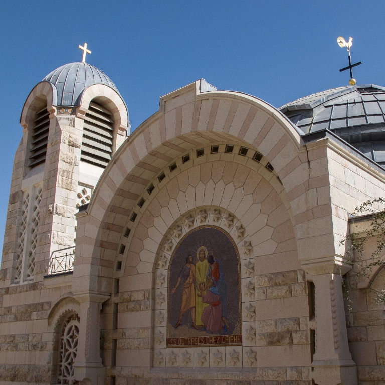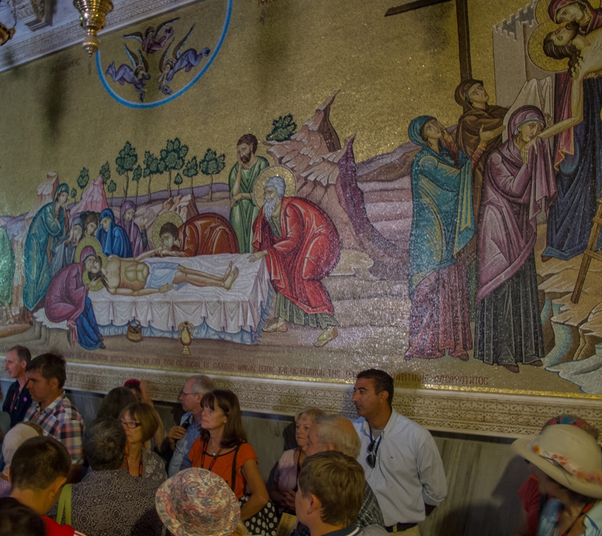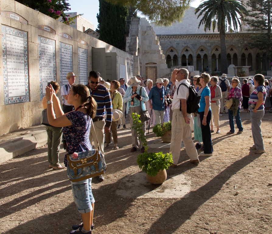 Day one took us to the Mount of Olives, which was the first goal of the first pilgrimages. Then we walked down the hill past the Pater Noster Church, where the Lord’s Prayer is written on plaques in over 60 languages around the cloister, descending again to the Dominus Flevit Church (see Luke 41-44) and downwards to Gethsemani.